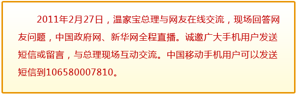 [中國移動(dòng)手機(jī)報(bào)讀者手機(jī)尾號(hào)7917]:總理好,我是一個(gè)即將畢業(yè)的大學(xué)生,我的愿望是找到一份工作。 |