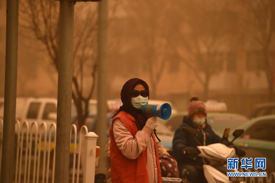 3月15日,在寧夏銀川市,志愿者在沙塵中引導市民出行。當日,我國北方多地出現(xiàn)沙塵天氣。新華社記者 唐如峰 攝