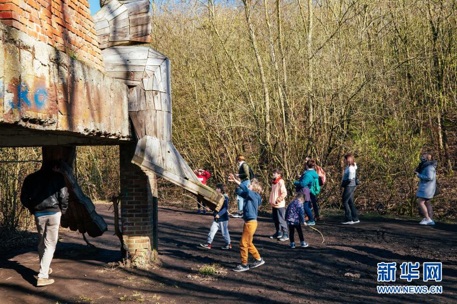 3月20日,人們在比利時(shí)博姆市的德舒爾森林公園和一座“巨人”雕塑“玩?!?。新華社記者 張鋮 攝