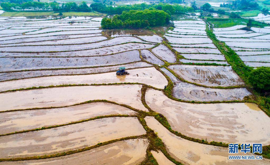 4月6日,江西省新余市仙女湖區(qū)鈐陽(yáng)辦事處白田村農(nóng)民駕駛農(nóng)機(jī)耙田、施肥,為早稻插秧作準(zhǔn)備(無(wú)人機(jī)拍攝)。