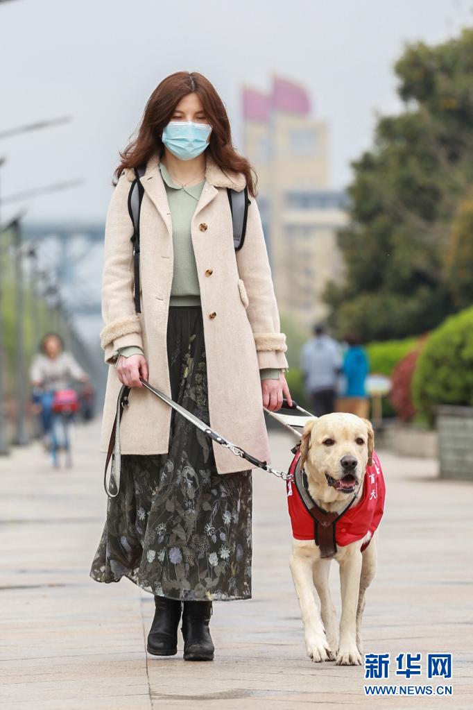 導(dǎo)盲犬“Bingo”陪伴李靜在南京長(zhǎng)江邊的景觀帶散步(3月27日攝)?! ⌒氯A社發(fā) (張夢(mèng) 攝)