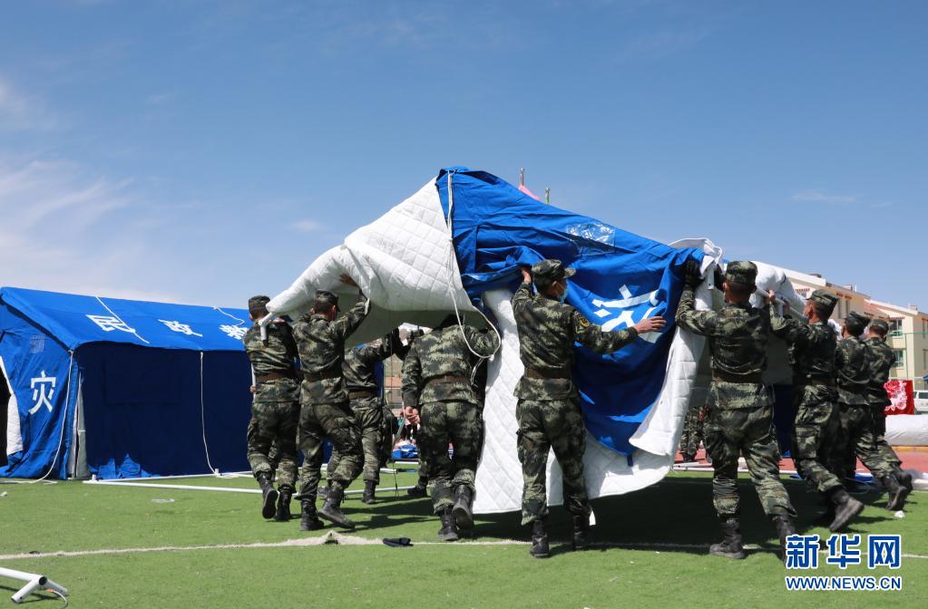 5月24日,武警青??傟?duì)果洛支隊(duì)機(jī)動(dòng)大隊(duì)官兵為花石峽鎮(zhèn)藏文中心寄宿制小學(xué)搭建帳篷教室。新華社記者 劉新 攝
