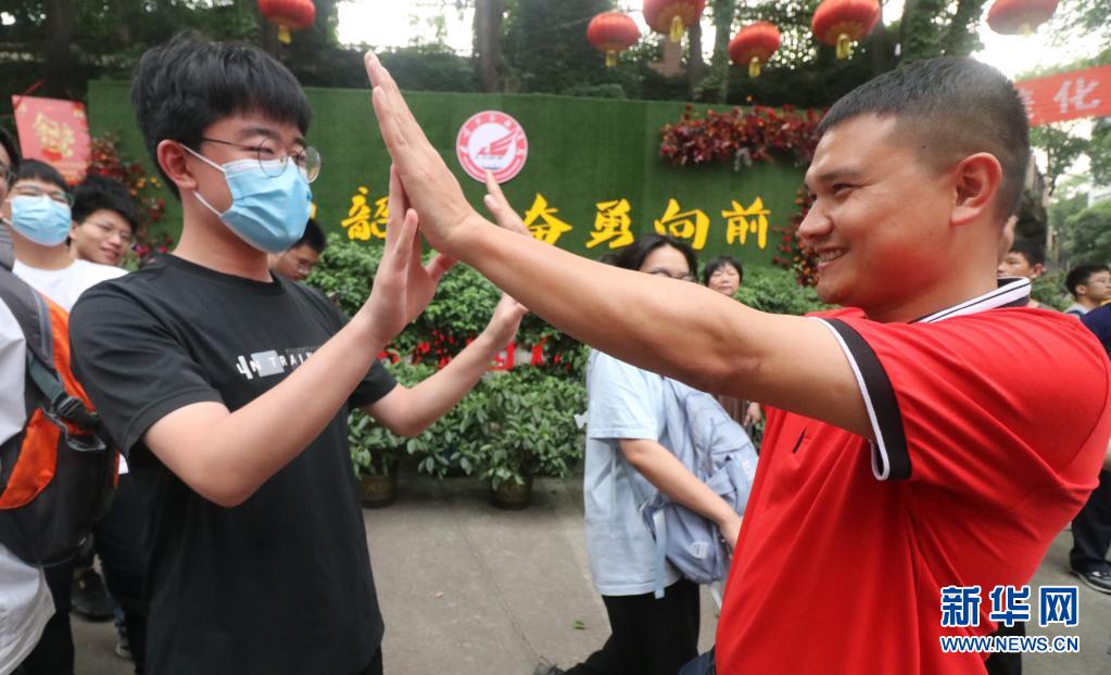 6月9日,在湖南省婁底市第二中學(xué)考點(diǎn),走出考場的老大李慶國和班主任宋老師擊掌。