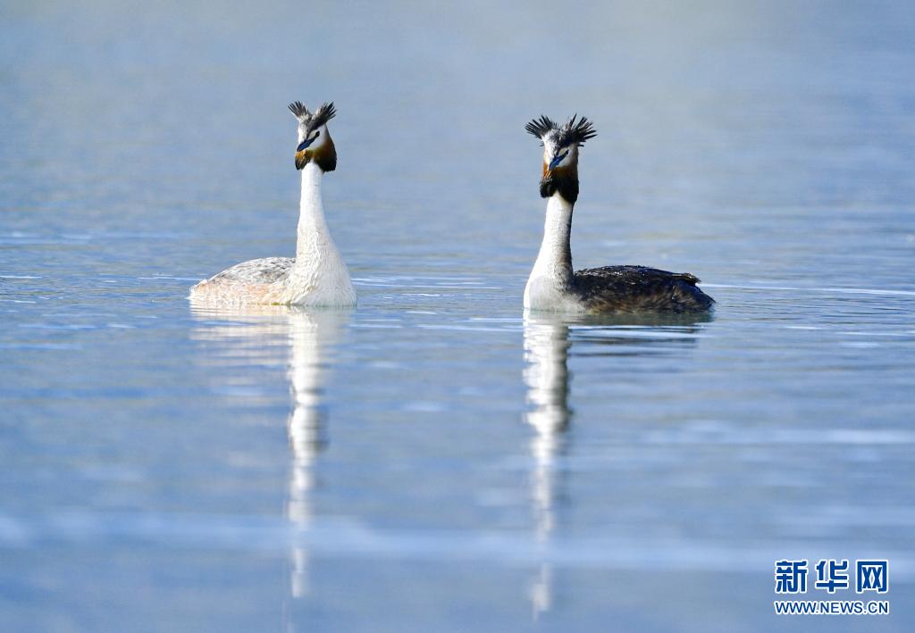 6月14日在拉魯濕地拍攝的兩只鳳頭??。夏日里,鳳頭??和小??在西藏拉薩拉魯濕地國家級自然保護(hù)區(qū)水面上嬉戲。新華社記者 張汝鋒 攝