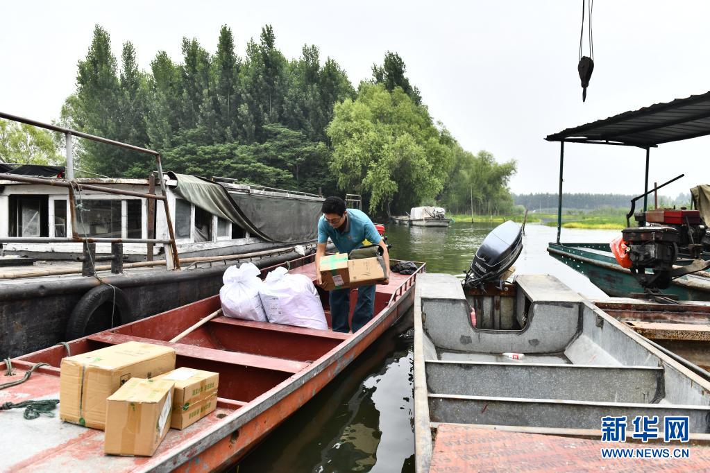 6月20日,在微山縣南陽(yáng)鎮(zhèn),郵遞員王少朋往郵船上裝郵件,準(zhǔn)備為村民投遞。