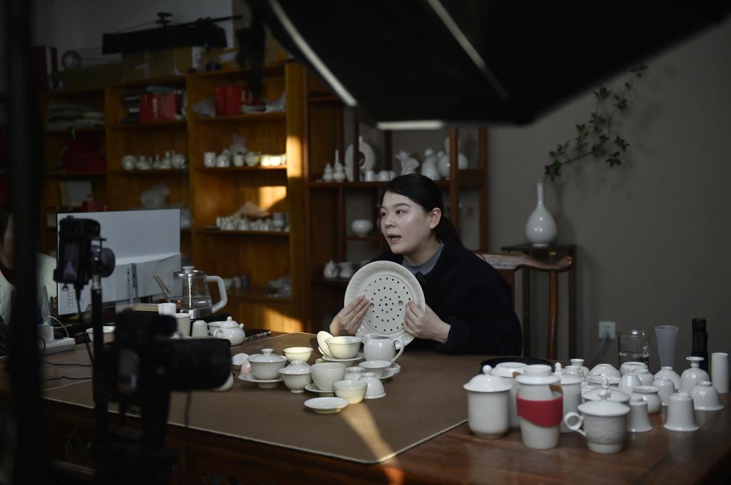 12月25日,工作人员在河北省曲阳县一家定瓷生产企业直播销售定瓷产品。