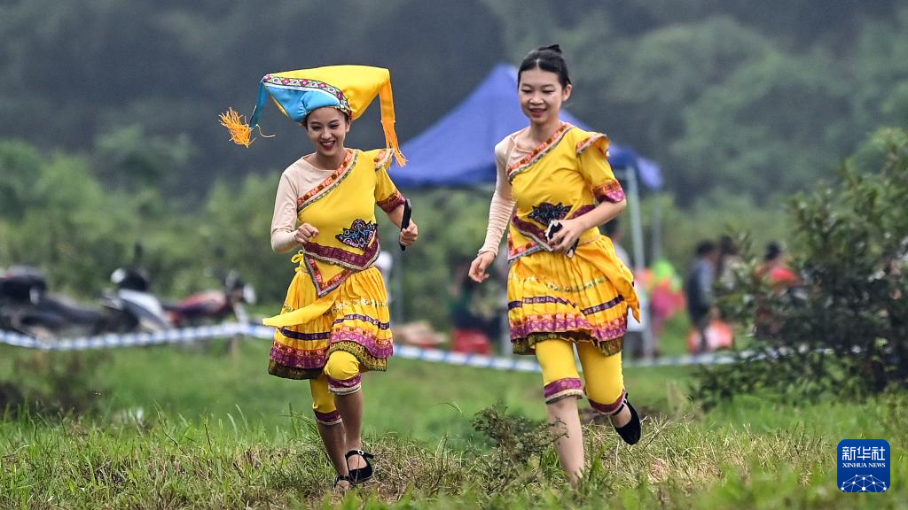 4月22日,在钦北区贵台镇洞利江河畔,两名少女在赶赴实景演出现场。