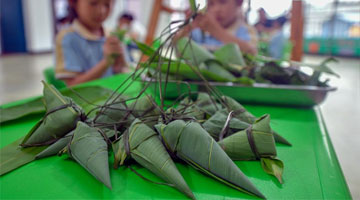 6月17日,安徽省宁国市胡乐镇村民在包粽子。