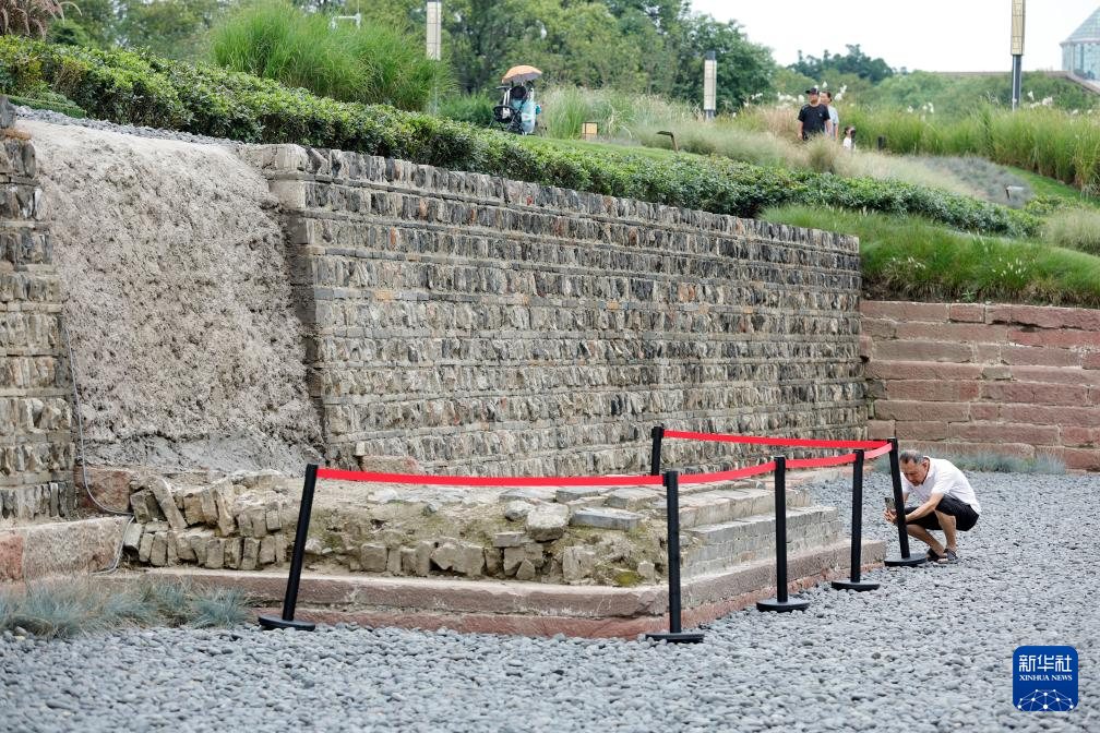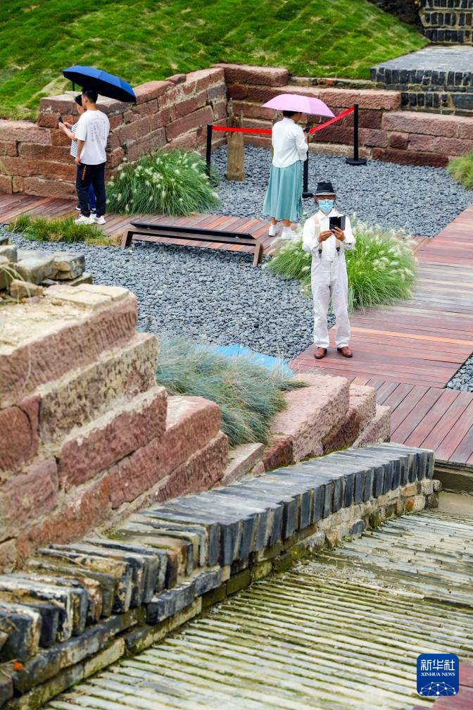 7月20日,在成都东华门遗址公园外场遗址区,人们在参观模拟展示的唐代庭院遗迹。