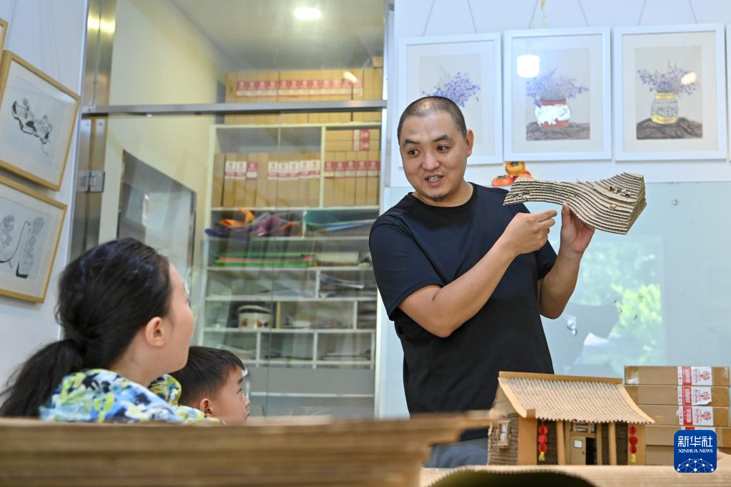 在位于山西省太原市万柏林区的工作室内,王帅栋和小朋友们分享瓦楞纸作品背后的地理知识(8月4日摄)。