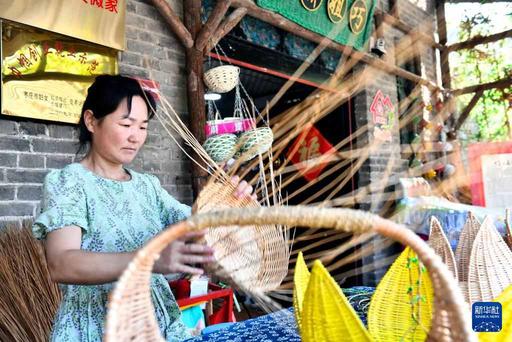 8月10日,在枣庄市薛城区柳编非遗工坊,非遗传承人赵秀梅在制作柳编。