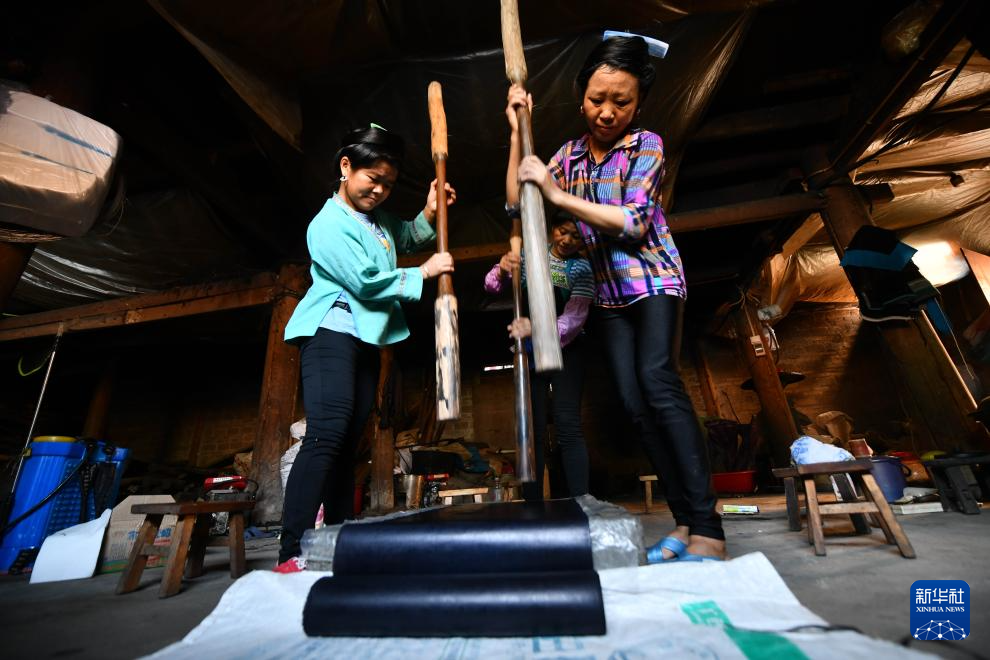 乌英苗寨妇女韦妹丽(右)在用传统亮布槌捶打布料(2020年9月2日摄)。