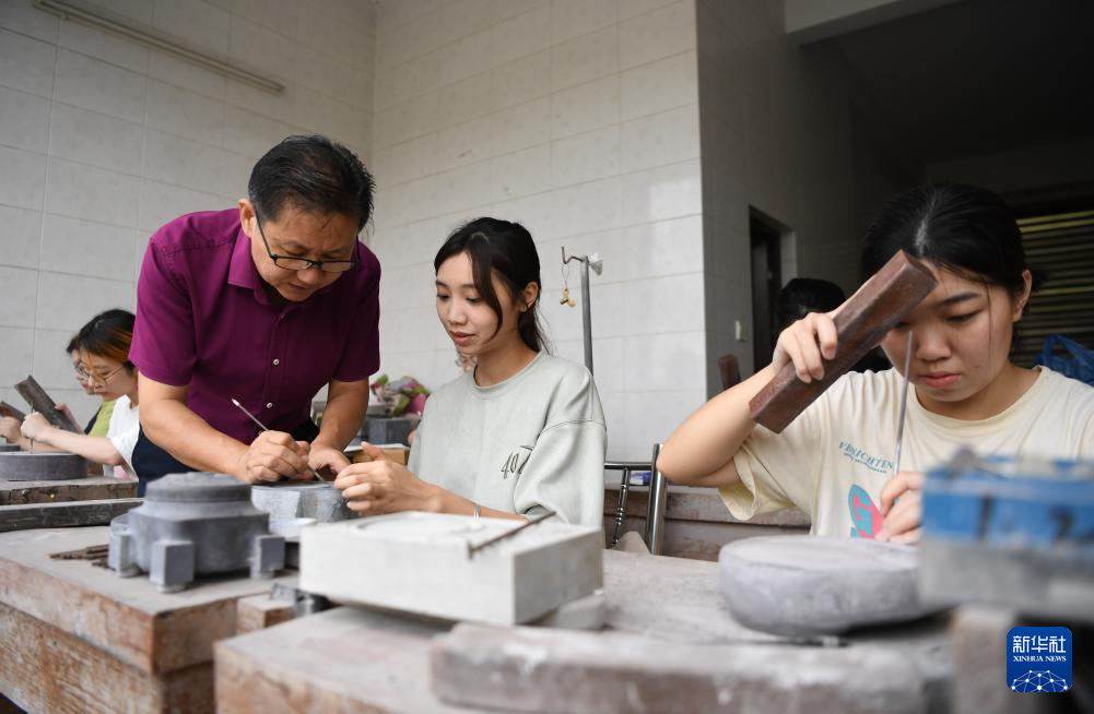 10月26日,在广东肇庆端砚文化村的加工车间,柳新祥给肇庆学院的实习生讲授示范端砚雕刻技法。