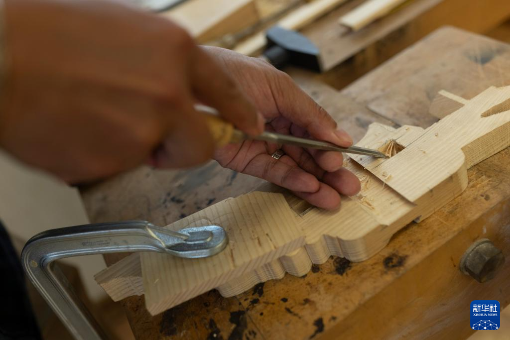10月10日,在斯洛文尼亚卢布尔雅那的民族志博物馆,故宫博物院专家鲍杰制作大门模型缺失的部件。