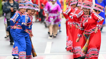 11月11日,摆手舞队伍在湖北省来凤县城武汉大道上表演。