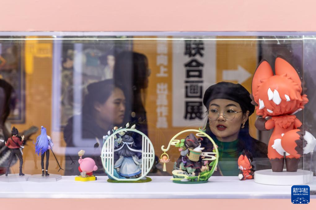 11月16日,人们在上海市闵行区展位观看当地文创公司的手办。
