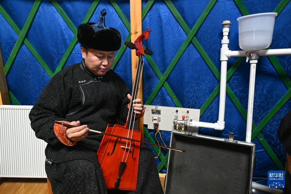 12月21日,在内蒙古锡林郭勒盟苏尼特右旗阿其图乌拉苏木,乌兰牧骑队员在演出前练习马头琴。