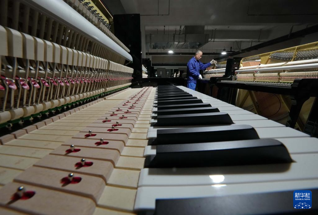 1月19日,工人在河北省肃宁县一家钢琴企业的生产车间工作。