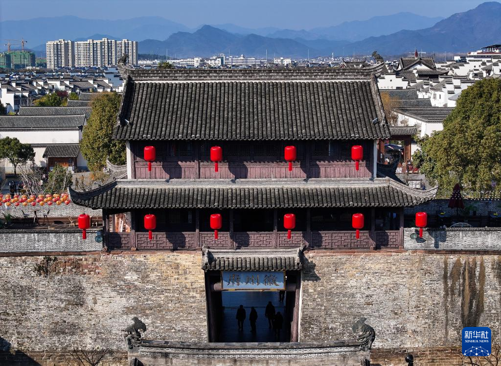 大红灯笼扮靓徽州古城(1月25日摄,无人机照片)。