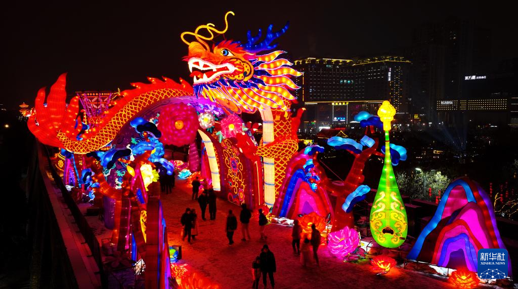 2月2日,龙形花灯在西安大唐芙蓉园点亮。