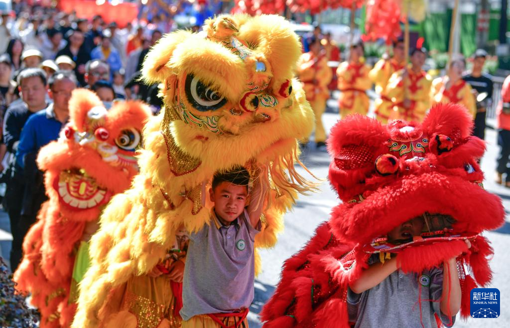 2月18日,贵州省龙里县的学生在民俗踩街活动中舞狮。