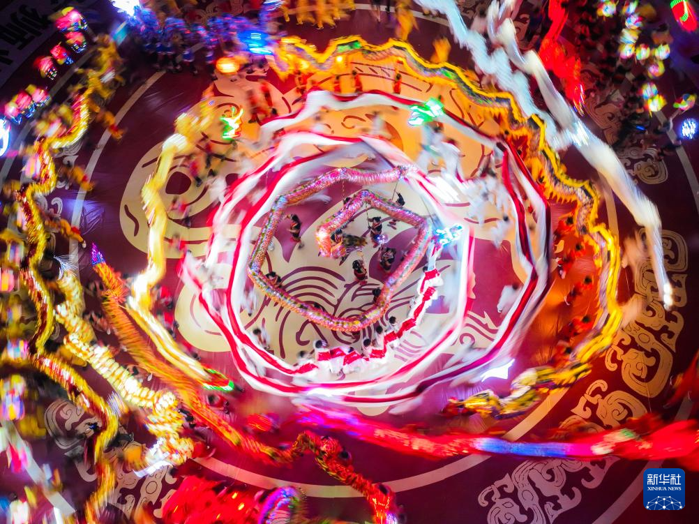 2月18日晚,湖南省永州市江华瑶族自治县图腾园广场,人们在参加龙狮灯会舞龙表演(无人机照片)。