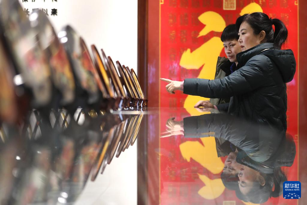 2月27日,刘晶涛(右)和徒弟王艺在凤城市边门镇的车间展厅里探讨作品。
