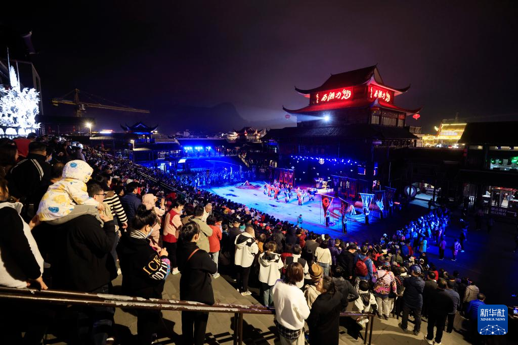 民俗大戏《魅力湘西》是湖南张家界“夜经济”的代表文化作品。今年以来,湖南张家界《魅力湘西》演艺团队对节目舞美编排、灯光音效等进行提质优化,创新多种方式展现湘西地区的风俗民情及特色文化,带给观众全新的视听体验。