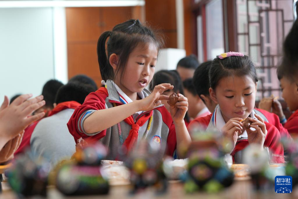 4月1日,学生在贵州省黄平县旧州古镇一家非遗工坊体验泥哨制作。