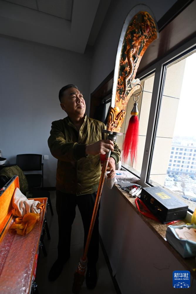 在山西省太原市迎泽区,武凌云上台演出前检查道具(2月2日摄)。
