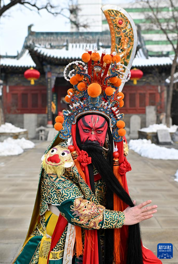 在太原大关帝庙,到此练习的晋剧非遗代表性传承人武凌云披挂戏装,一手持青龙偃月刀,一手掠须,威风凛凛,举手投足间显现关公风范。