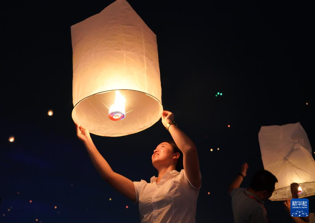 4月13日晚,人们在云南省景洪市澜沧江边放飞孔明灯。