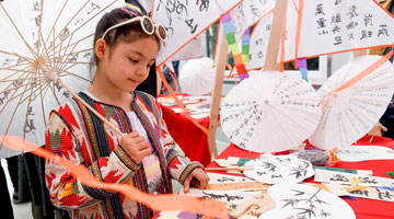 闫森林(中)在给宁夏艺术职业学院学生介绍贺兰砚作品(4月15日摄)。