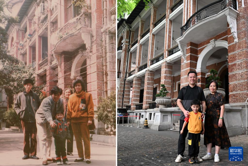 拼版照片:左图为广州市民杜煜杰(前中)与母亲(右一)等于1989年在广州沙面合影(受访者提供);右图为杜煜杰(后左)与母亲、儿子在广州沙面同一栋建筑前合影(新华社记者邓华摄)。