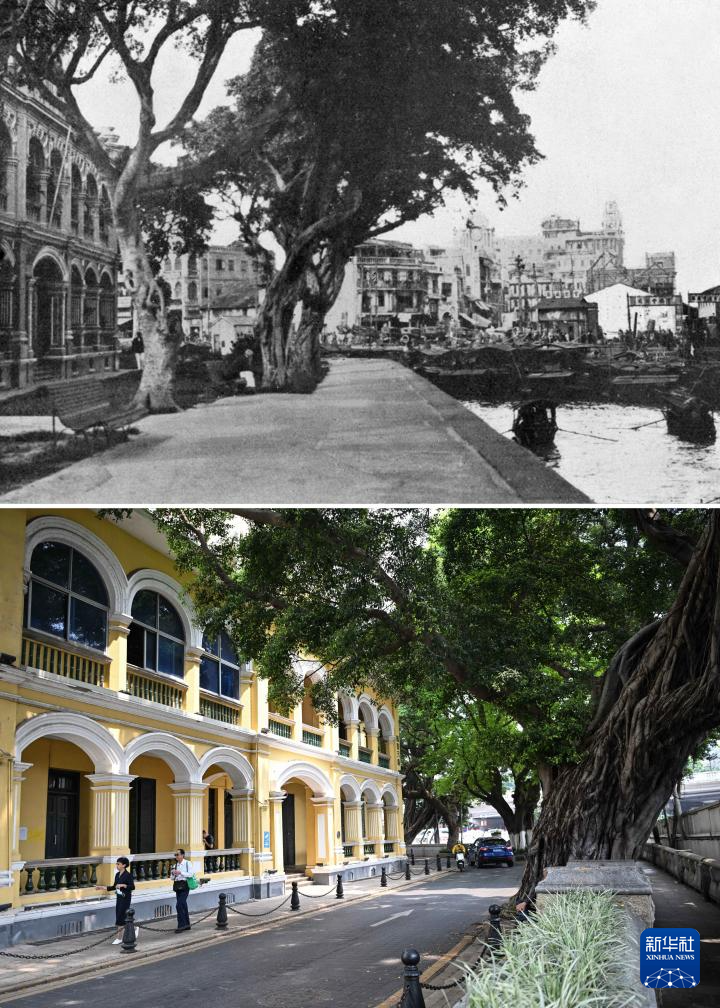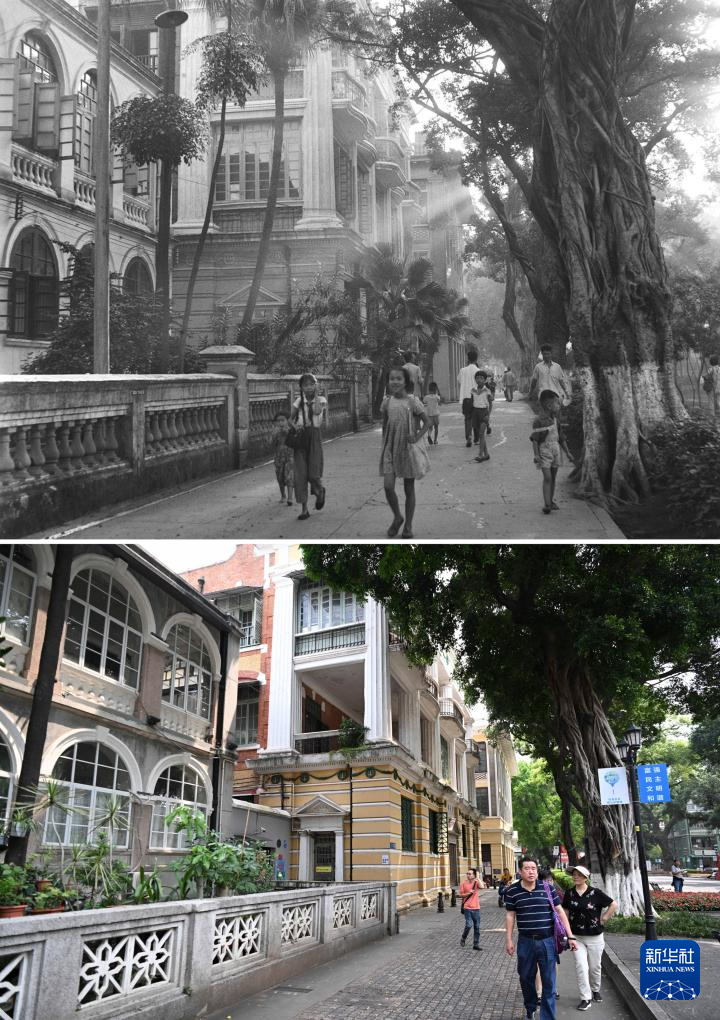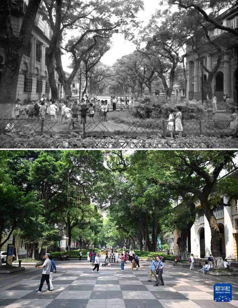 拼版照片:上图为广州沙面大街街景(资料照片);下图为2024年4月11日在同一位置拍摄的广州沙面大街(新华社记者邓华摄)。