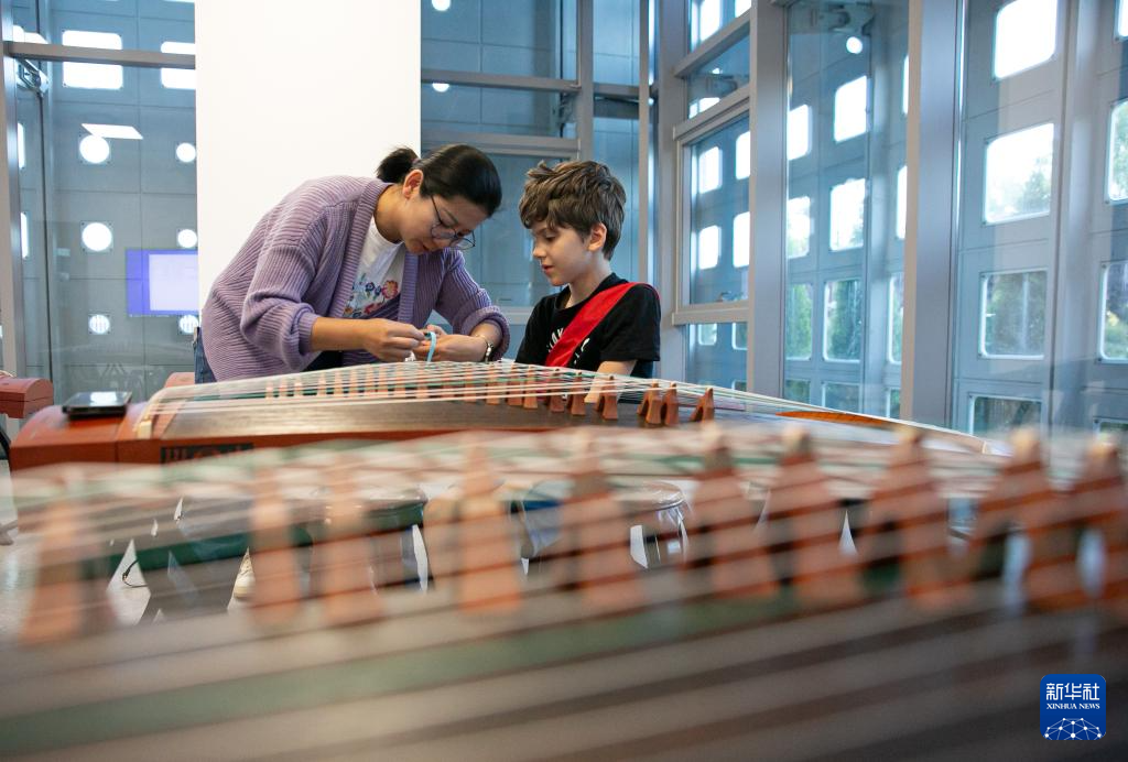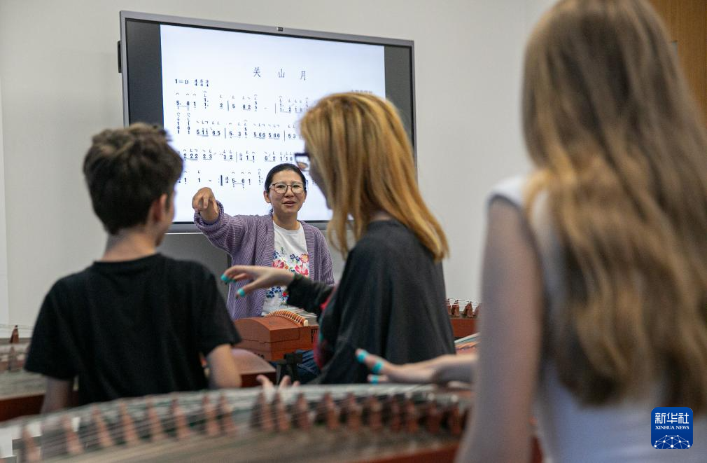 4月29日,在塞尔维亚贝尔格莱德中国文化中心,古筝指导老师王宣(后)在教学。
