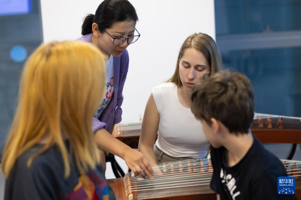 4月29日,在塞尔维亚贝尔格莱德中国文化中心,古筝指导老师王宣(后左)在教学。