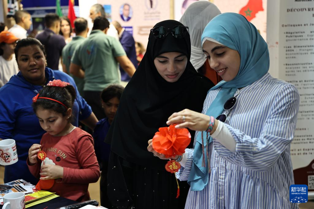 5月11日,人们在摩洛哥拉巴特国际书展的中国展台上选购文创产品。