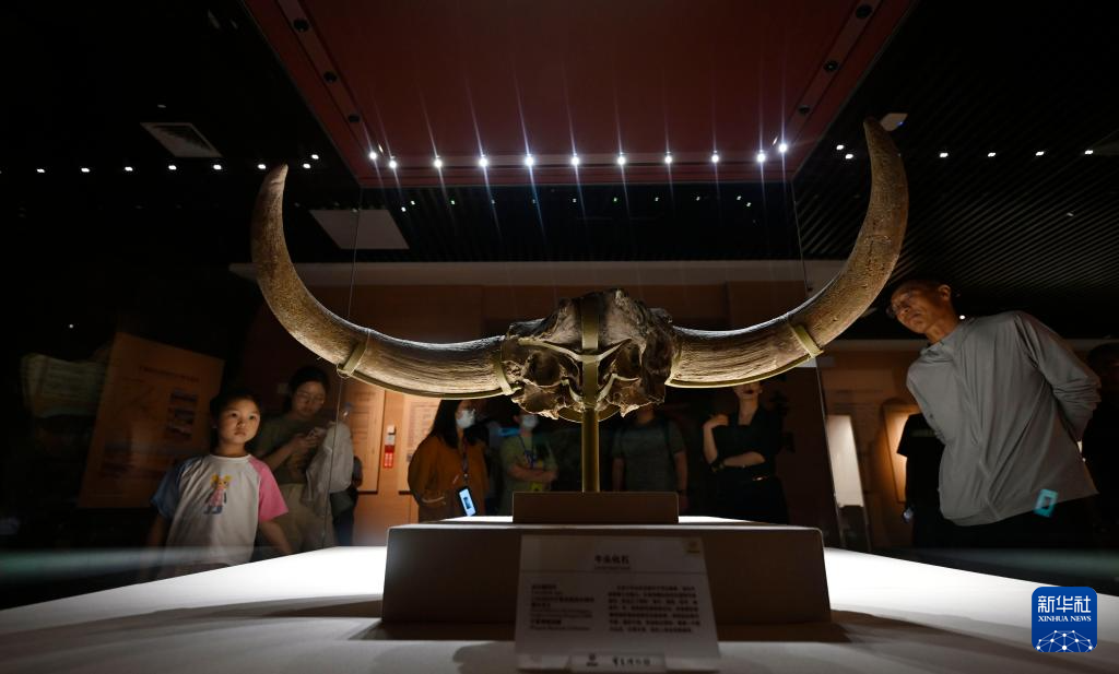 游客在宁夏博物馆欣赏展出的牛头化石(5月14日摄)。