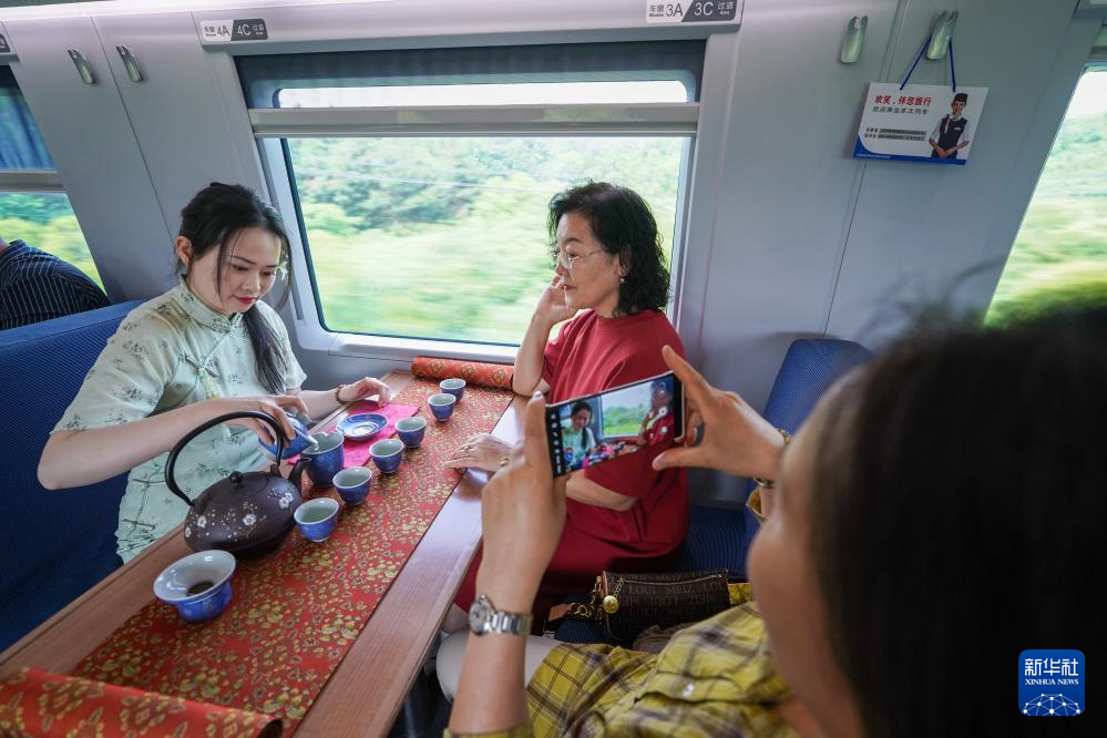 5月20日,南京客运段工作人员(右一)在G2807次高铁列车车厢内进行茶艺表演。
