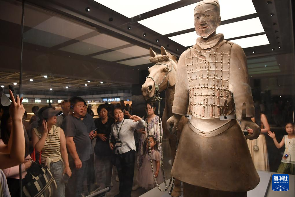 5月17日,游客在位于西安市临潼区的秦始皇帝陵博物院内参观鞍马骑兵俑。