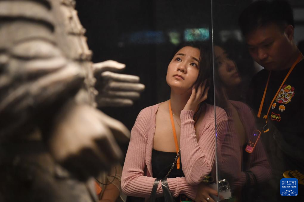 5月17日,游客在位于西安市临潼区的秦始皇帝陵博物院内参观一尊兵马俑。