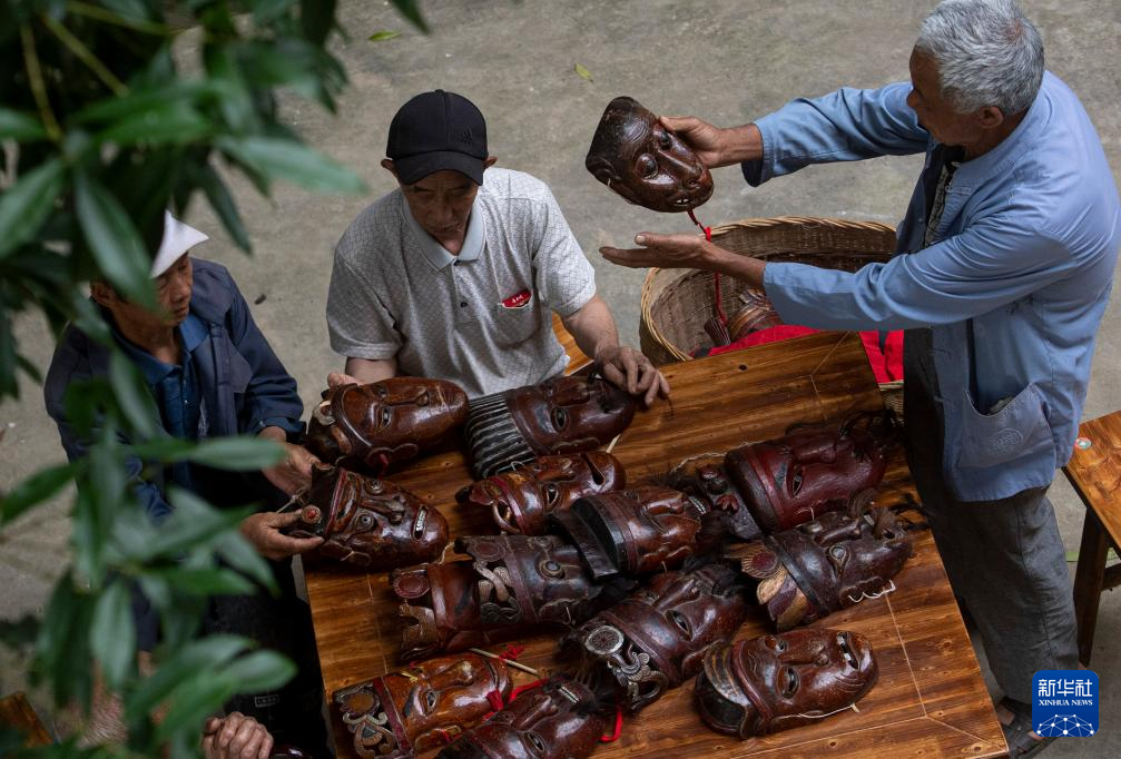 5月16日,在陈家老屋前的院坝,戏班子成员围坐在摆满阳戏面具的桌旁商量剧目、分配角色。