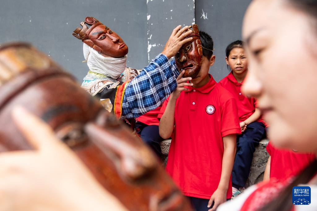 5月17日,在酉阳县丁市镇溪口小学校,小学生在陈永霞的帮助下体验阳戏面具。