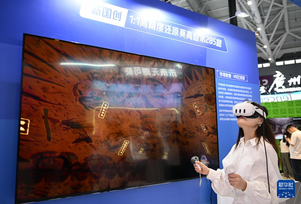 5月23日,在第二十届文博会粤港澳大湾区文化产业创新展的腾讯展区,观众体验“寻境敦煌”VR数字沉浸展。
