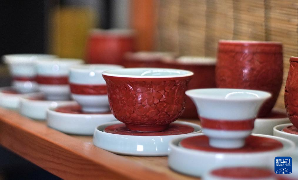朱江设计的实用性雕漆工艺品(6月5日摄)。