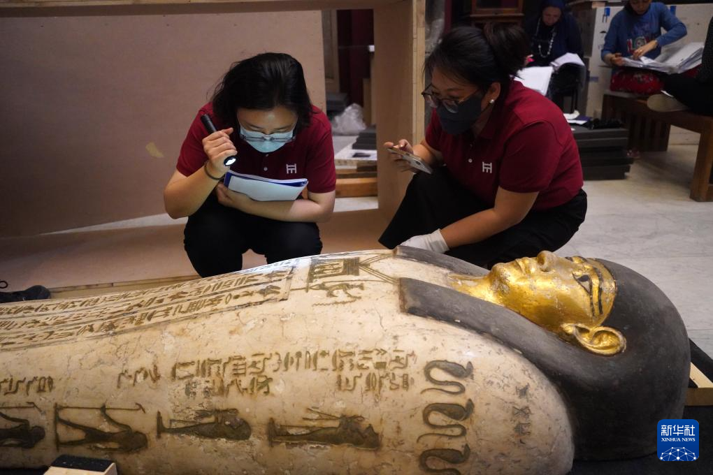 5月23日,在位于埃及首都开罗的埃及国家博物馆,上海博物馆的工作人员对一件木乃伊棺盖进行检查。