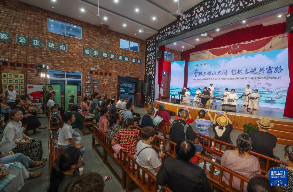 6月15日,村民们在建德市三都镇镇头村文化礼堂内观看杭州师范大学音乐学院学生与村民乐队表演。