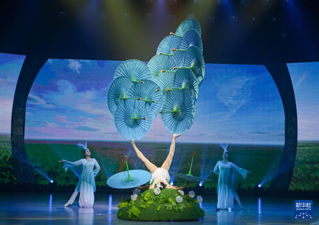 6月18日,在第十二届中国杂技金菊奖全国魔术·滑稽比赛开幕式上,大连杂技团演员表演蹬伞《蒲公英·远方》。