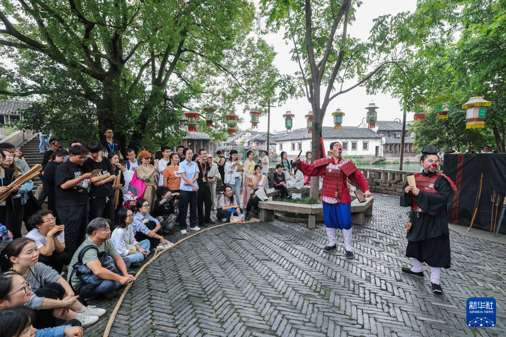 10月17日,游客在乌镇街头观看古镇嘉年华的演出剧目。